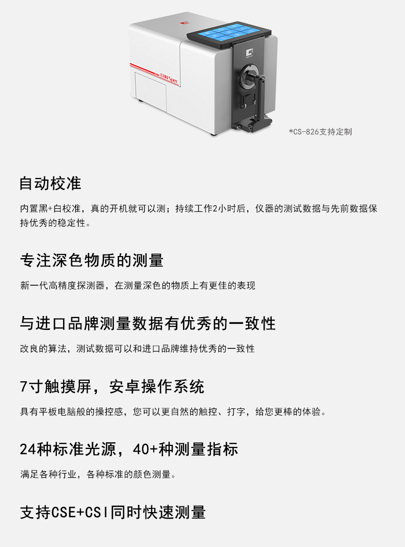 高精度臺式分光測色儀CS-826是一款高精度、高穩(wěn)定性的顏色測量儀器;先進的工藝技術(shù),強大的數(shù)據(jù)處理器,讓CS-826在黑色物體的顏色測量上具有優(yōu)秀的表現(xiàn);儀器的自動校準(zhǔn),保證了長期測量的穩(wěn)定性;改善的照明光源,在測量熒光和可見光上都有驚艷的展現(xiàn),且儀器測量數(shù)據(jù)能與進口品牌維持優(yōu)秀的一致性。