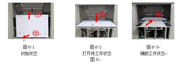 在圖6中的圖6-1初始狀態(tài)下,在標(biāo)志①處整體往上拉,使活動托板的下端往上抬高,同時在②處往外拉,直到活動托板處于水平位置,圖6-2中顯示的③打開待工作狀態(tài)。